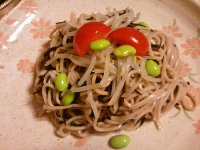 こちらは蕎麦をアレンジした一品。そばつゆ・オリーブオイル・酢を混ぜ合わせて上にかけています。かなりイケます♪