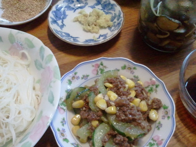 そして手前は大きくなりすぎたキュウリを使ったおかず(私作) とにかくキュウリづくしでした。