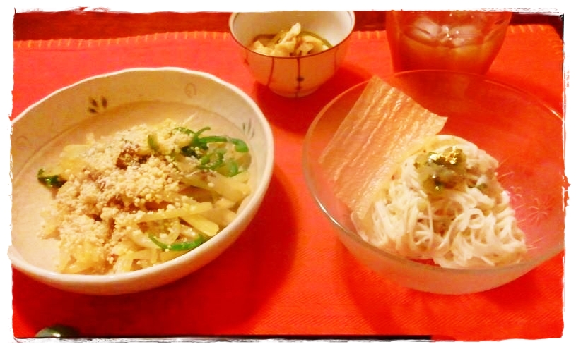 素麺のゴマ風味サラダ+雑穀米のお粥