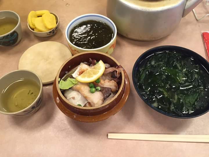 ハマチのお刺身、魚のアラで炊いた釜飯、ワカメ汁、トロトロのもずく酢…