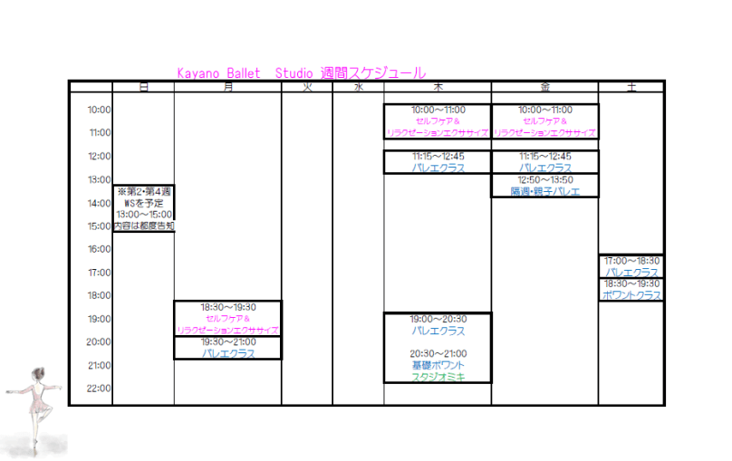 4月から、新宿御苑前第2タケビルの スタジオと、代々木スタジオミキとの2か所で レッスンを行っていきます。 第2タケビルでのレッスン、4月中は 1回無料体験が出来ます。 Kayano Ballet Studio HP