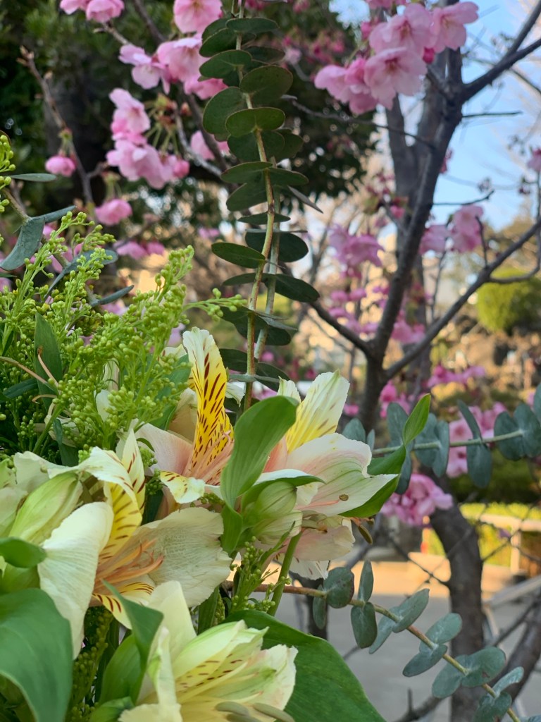 先日氏神様へお散歩途中、急に呼び止められ開店祝いのお花をもらいました。